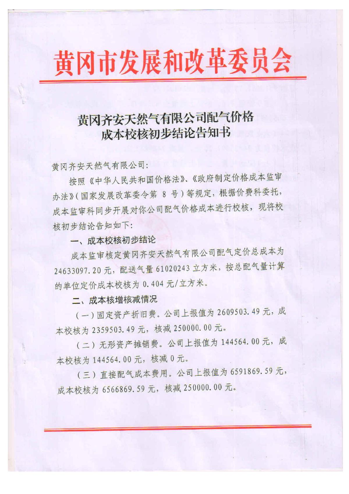 黃岡齊安天然氣有限公司配氣價格成本校核初步結(jié)論告訴書